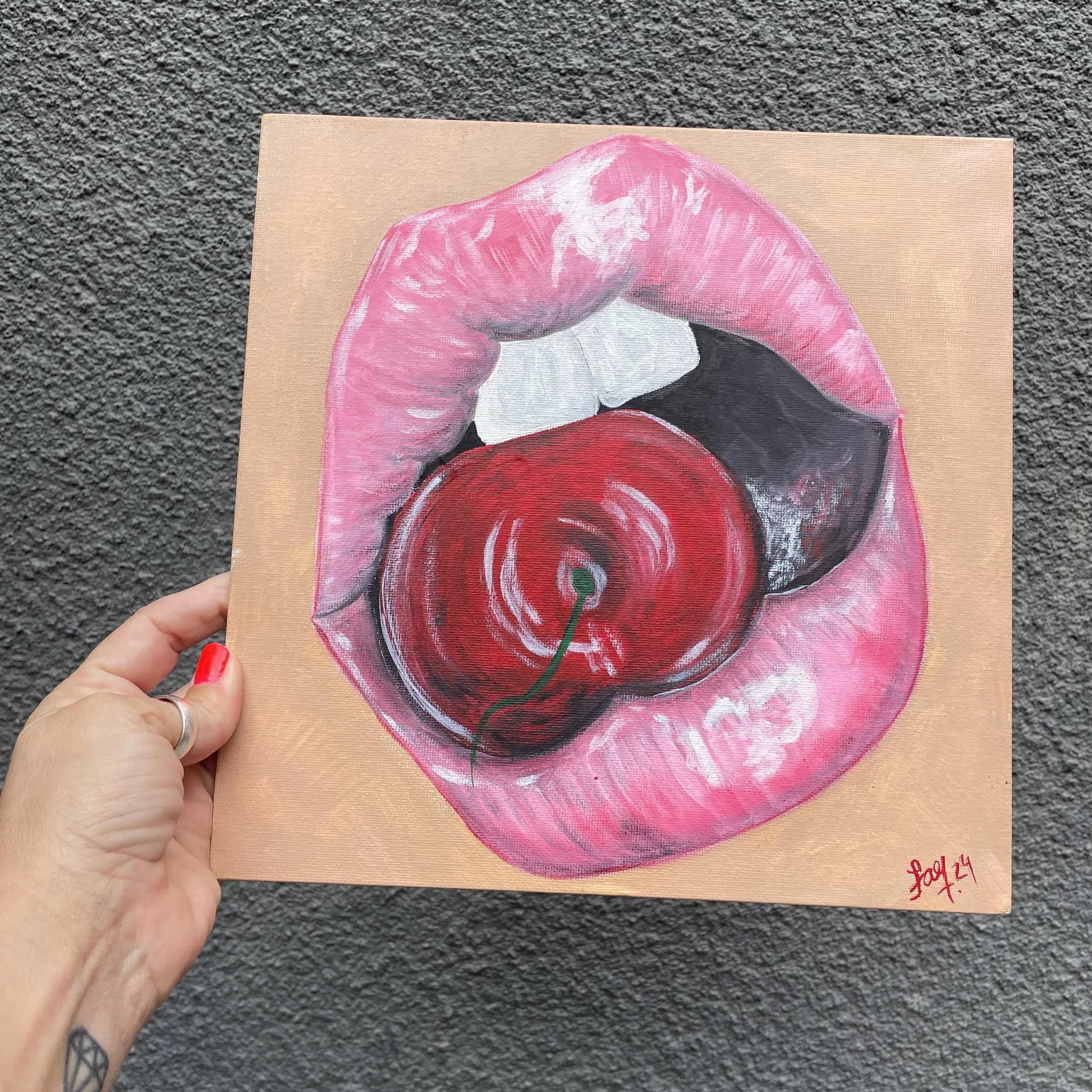 Cherry Temptation is a bold and sensual exploration of desire, captured in a striking 10”x10” mixed media painting. This piece, part of a limited series of five, features rich acrylic paint on a gold leaf background, creating a luxurious and eye-catching contrast. The vivid red lips and juicy cherry evoke passion and indulgence, while the dripping accents add an element of raw intensity. 'Cherry Temptation' is a statement piece that brings energy and allure to any space.