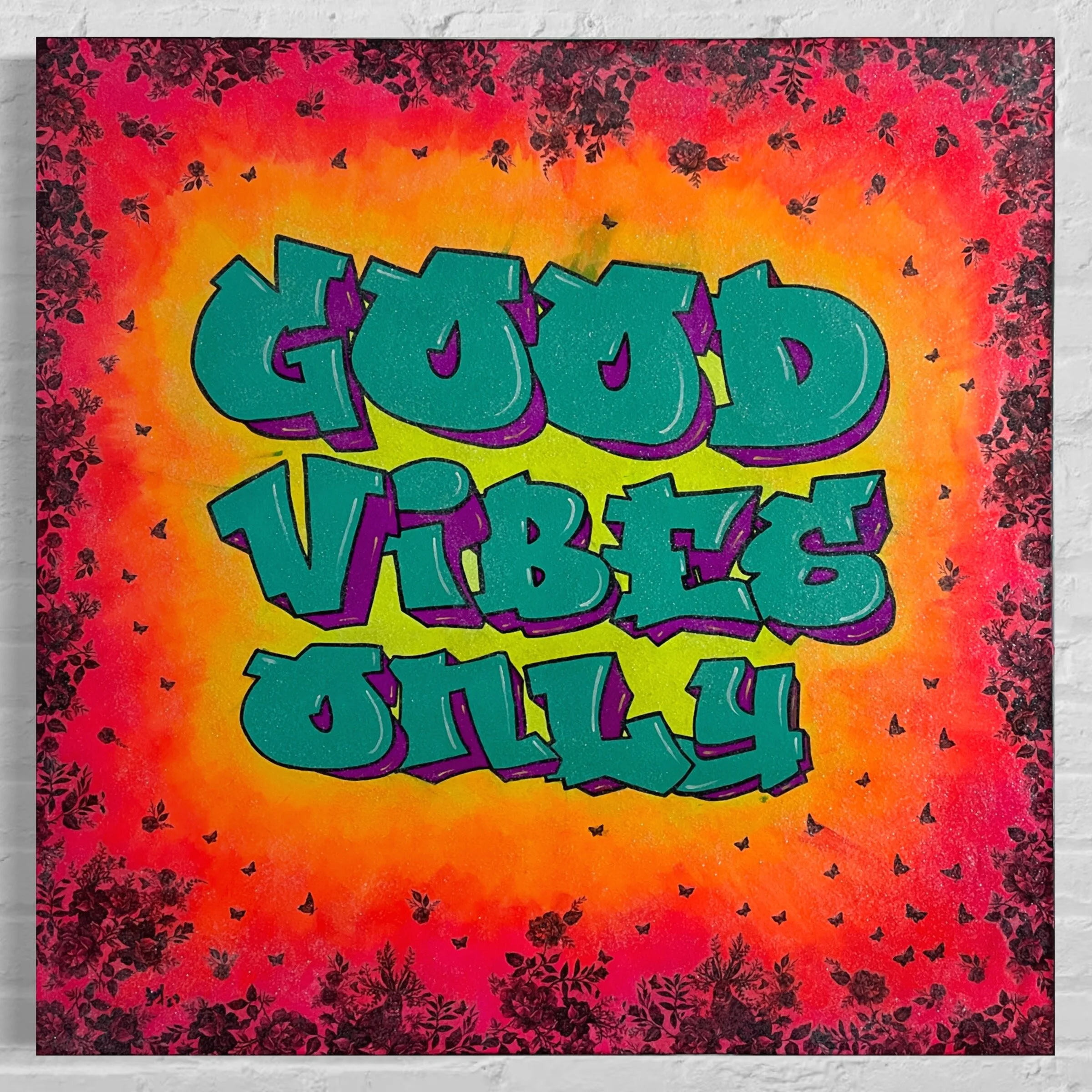 In a world where colors speak louder than words, this vibrant collage painting comes alive with warmth and positivity. The background, a radiant gradient from neon pinks at the edges to a glowing yellow at the center, sets the stage for a message that resonates with pure energy: "Good Vibes Only." Written in bold turquoise and purple, the quote stands as a beacon of positivity, urging all who gaze upon it to embrace joy and kindness.
