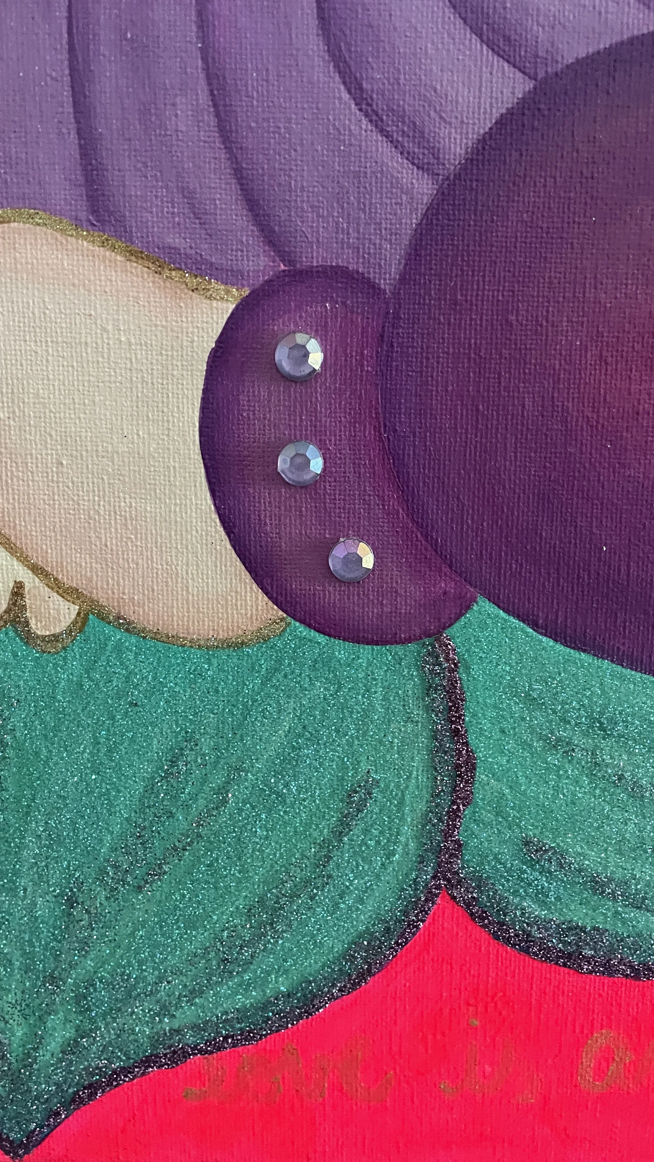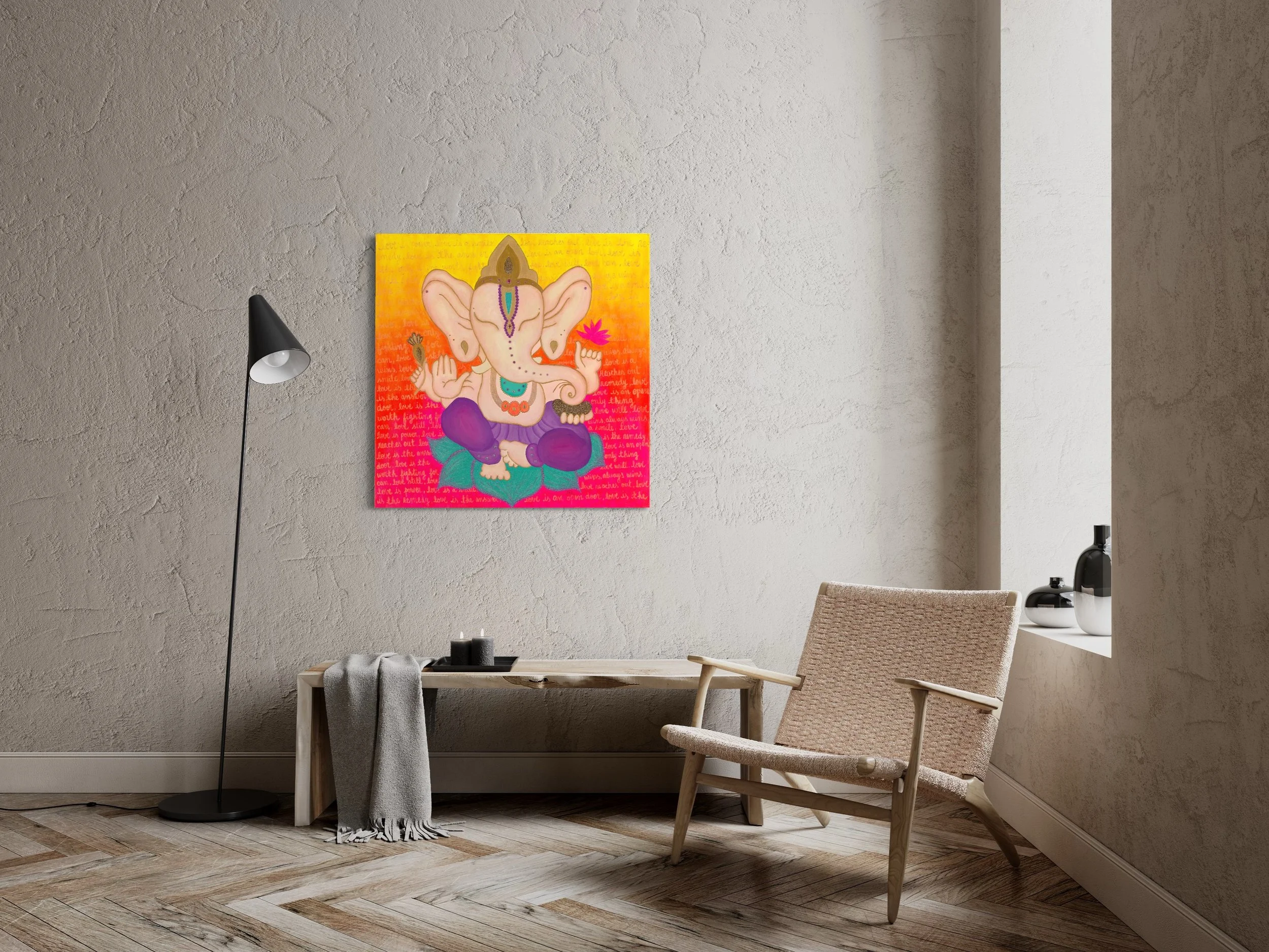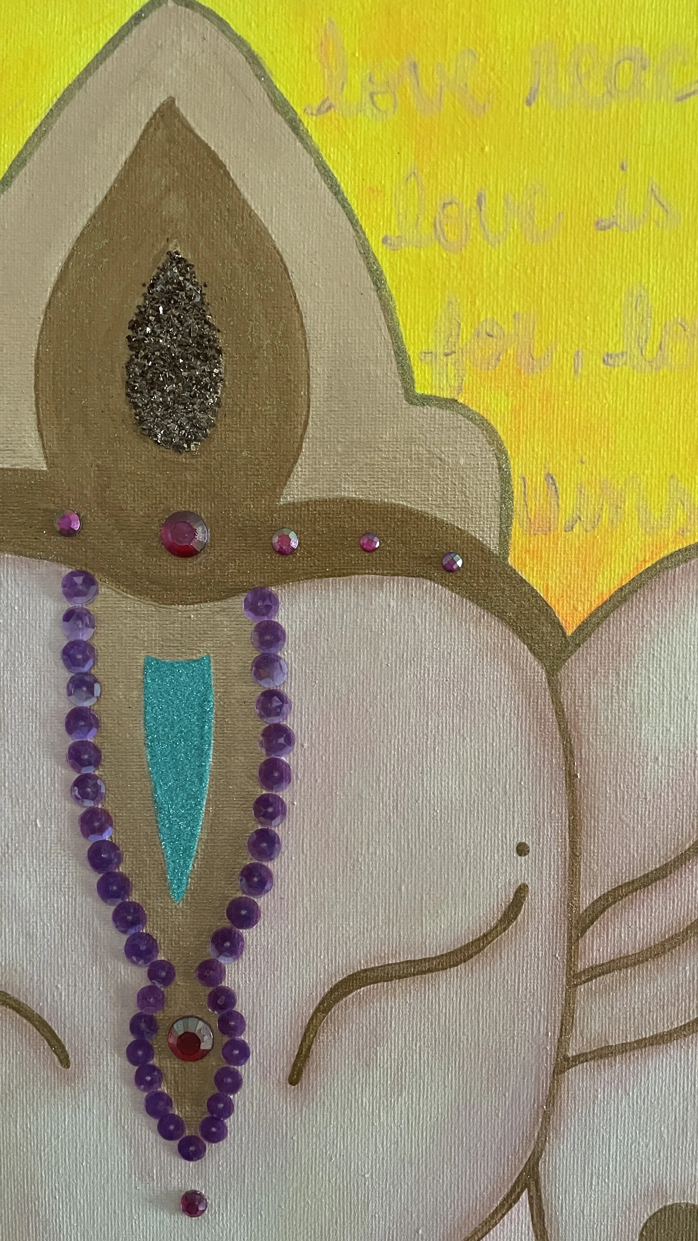 This painting was inspired by a transformative journey to India, where I was moved by the teachings of love and compassion embodied by the Buddhist tradition. Against a warm and radiant background of oranges, yellows, and reds, a colorful Buddha sits at the top, symbolizing the wisdom and peace that can be found in the practice of love. Behind the Buddha's head is a golden mandala, a reminder of the interconnectedness of all things and the infinite potential of love to bring us together. The lyrics of the song “Love Wins” by Carrie Underwood, extolling the power of love to conquer all, are written in elegant script along the background of the canvas. This painting is a celebration of the boundless power of love and a call to action, inviting us all to carry its message of hope and compassion into the world.