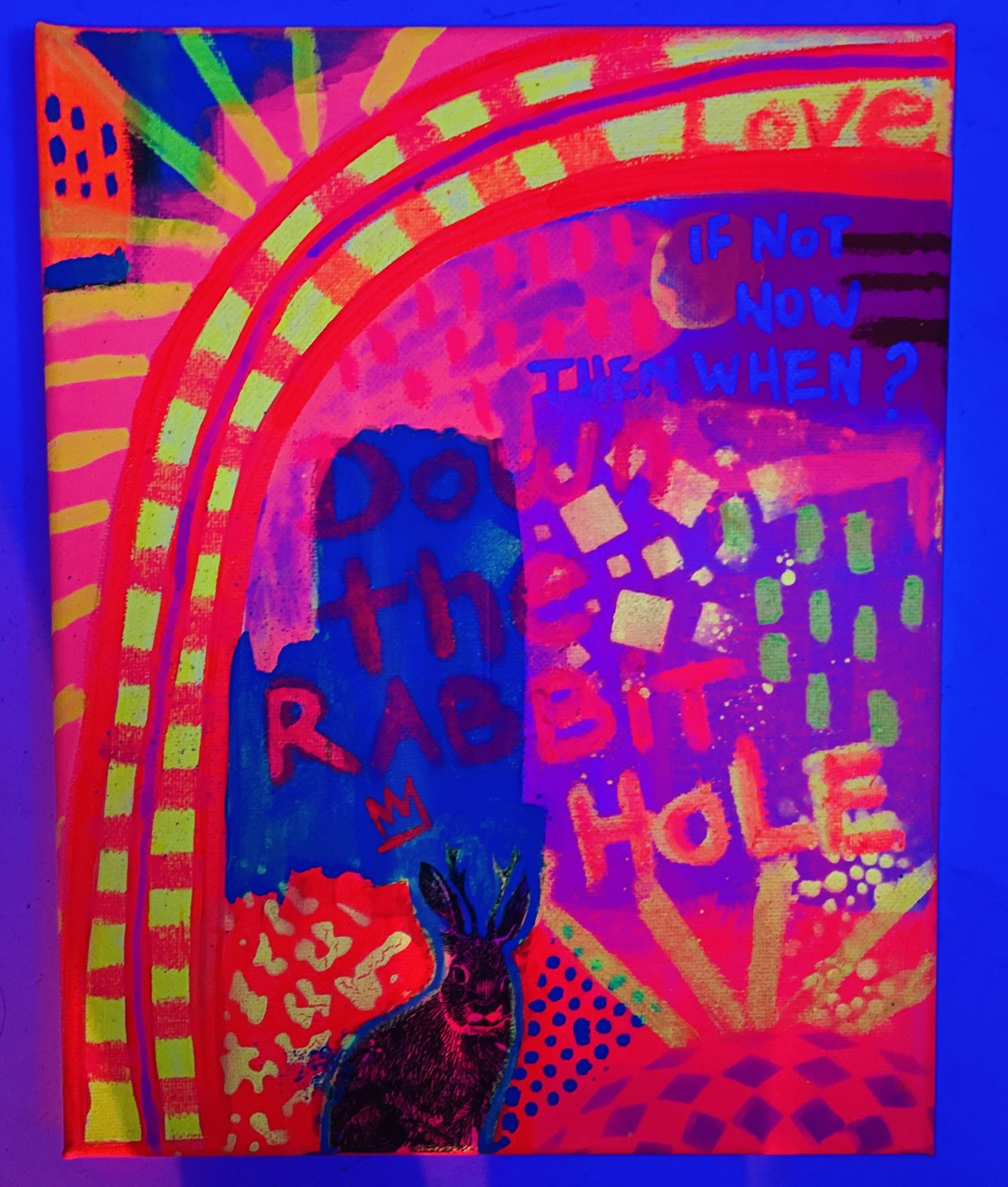 "This truly one-of-a-kind painting boasts an antique ornate mirror as its canvas, infusing the artwork with a mesmerizing interplay between the glass mirror and the vibrant neon hues of the background. The black and white mushrooms in the center appear to be melting into the ethereal space, adding to the trippy, dreamlike quality of the piece."