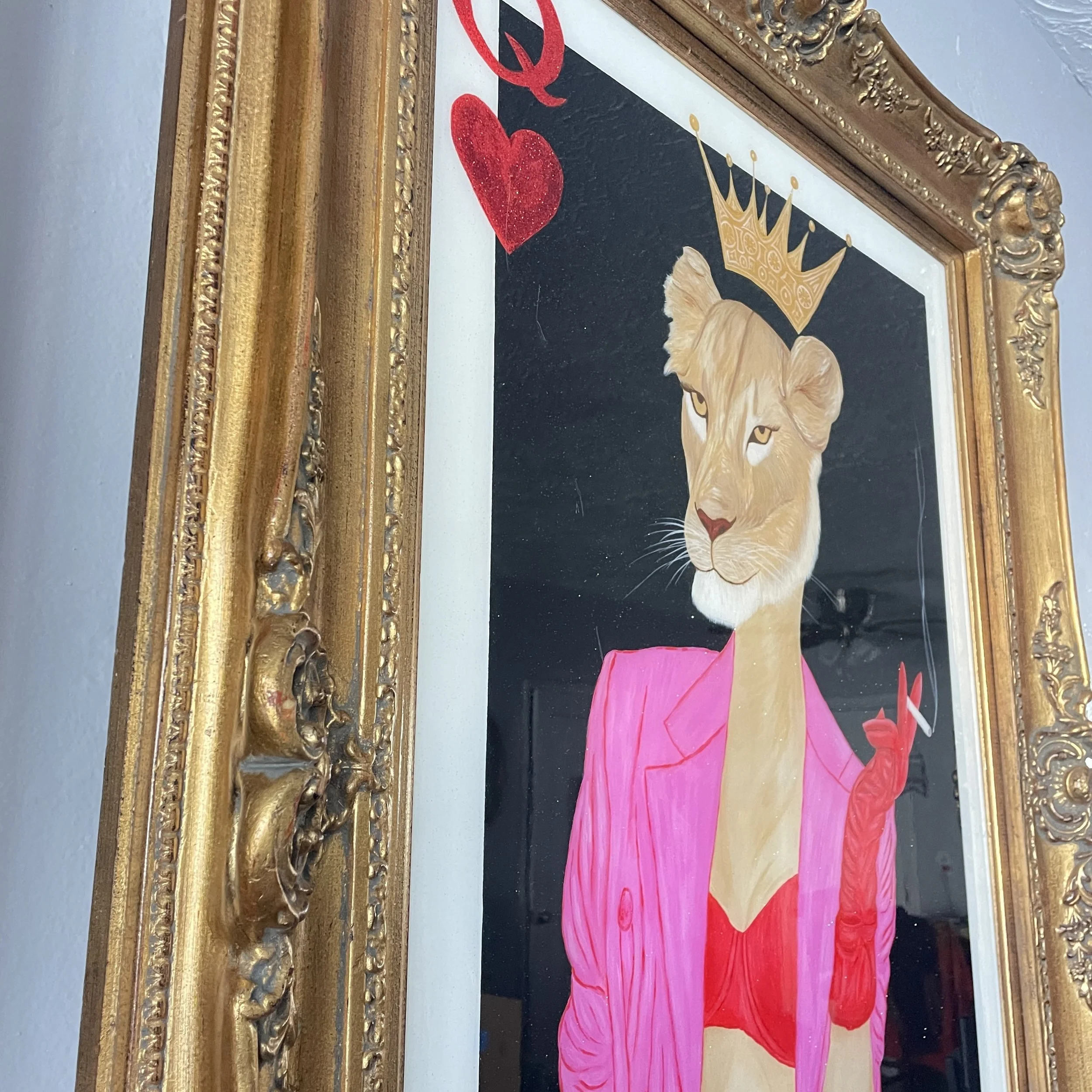 In the game of life, we are dealt many hands but only a select few have the courage to play them to the fullest. The King of Diamonds is one such player. With his steely gaze and unbreakable confidence, he commands the room. The k of diamonds card at the center of the painting represents his love of high-stakes gambling and his skill at bluffing his opponents. As the lion dressed in his finest suit surveys the roulette table, he knows that fate is in his hands. He is not one to sit on the sidelines and watch life pass him by. No, he is a gambler. And he plays to win.